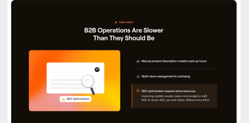 The layout organizes information to guide users from problem to solution without friction. Strong visuals reinforce the shift from static product content to more engaging formats, supporting the product’s value. The result is a focused landing experience that presents AI as a practical tool for driving sales, not just an added feature.