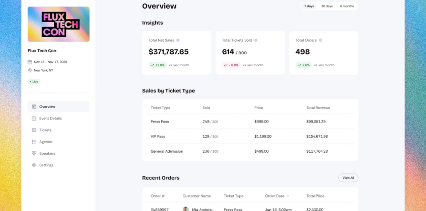 Heyo designs Eventrise to give event organizers immediate visibility into performance without relying on complex reports. The dashboard presents key metrics like ticket sales, trends, and revenue in a clear, easy-to-digest layout. Color is applied strategically to separate data points and highlight changes, making it easy to identify what needs attention.